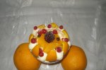 Portocala am curatat-o si baiat-o bucatele mici si dupa cum mi-a venit in imaginatie am asezat bucatelele impreuna cu miezul de lapte frisca ,pepitele de ciocolata,coacazele si mura. Imaginea va arata cam ce mi-am imaginat pentru un desert usor si repede de facut.