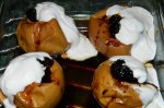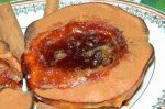 Merele se spala si se scobesc cu un cutit subtire de cotor. In locul cotorului se pun cateva bucati de samburi de nuca, scortisoara si zahar brun. Se dau la cuptor pentru 25-30 minute. Se scot din cuptor cand se inmoaie. (eu le-am tinut mai mult si s-au decojit) Cand se scot din...