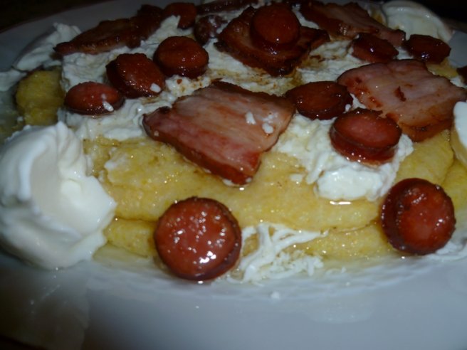 Mamaliguta in straturi cu bacon si cabanos