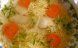 Curățăm, spălăm legumele și le tăiem bucățele mici. Un morcov dăm pe răzătoarea mare iar ceapa o tocăm mărunt și le călim în puțin ulei (50 ml). Adăugăm în zeamă legumele mărunțite, morcovul cu ceapa călită. Adăugăm leușteanul spălat și tocat...