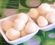Frecam bine untul moale cu zaharul,adaugam 150 gr nuca de cocos,sucul de la o portocala si esenta de vanilie.Din aceasta compozitie,luam cu lingurita si formam bomboane rotunde in mijlocul carora introducem o aluna.Trecem bomboanele prin cele 50 gr nuca de cocos ramase.