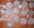 Punem pâinea în apă să se înmoaie, după ce s-a înmuiat, o stoarcem bine și o punem peste carne. Punem și usturoiul pisat, sare, piperul continentele, oul usturoiul granule și amestecăm bine, apoi facem biluțe care le apăsăm puțin să iasă mai plate și le dăm prin făină.