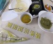 Decorațiunile de ciocolată: se topește ciocolata albă pe baie de abur, se lasă un pic la răcit, se toarnă în 3 cești: una va rămâne albă, în cea de-a doua se adaugă un vârf de cuțit matcha, iar în cea de-a treia – un vârf de cuțit de turmeric, omogenizând culorile. Se toarnă cele trei într-un singur poș, alternând culorile (câte o linguriță din fiecare culoare) și se desenează diverse decorațiuni, se pot folosi șabloane pentru fluturi, pătrate, spirale sau ce altceva vă mai place.