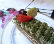 Eu am pregătit prăjituri cu foi de pișcot colorate în verde cu matcha, cremă mascarpone cu frișcă și aromă delicată de fistic, pudrate cu matcha și decorate cu fructele prezente la tarabe zilele acestea: delicioasele căpșuni și cireșe. Pentru decorațiunile de ciocolată am folosit coloranți naturali: turmeric și matcha.