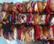Dupa 30 de minute, formam frigaruile, alternand bucati de carne, ardei gras si ananas, avand grija ca la ambele capete sa avem bucati de carne.