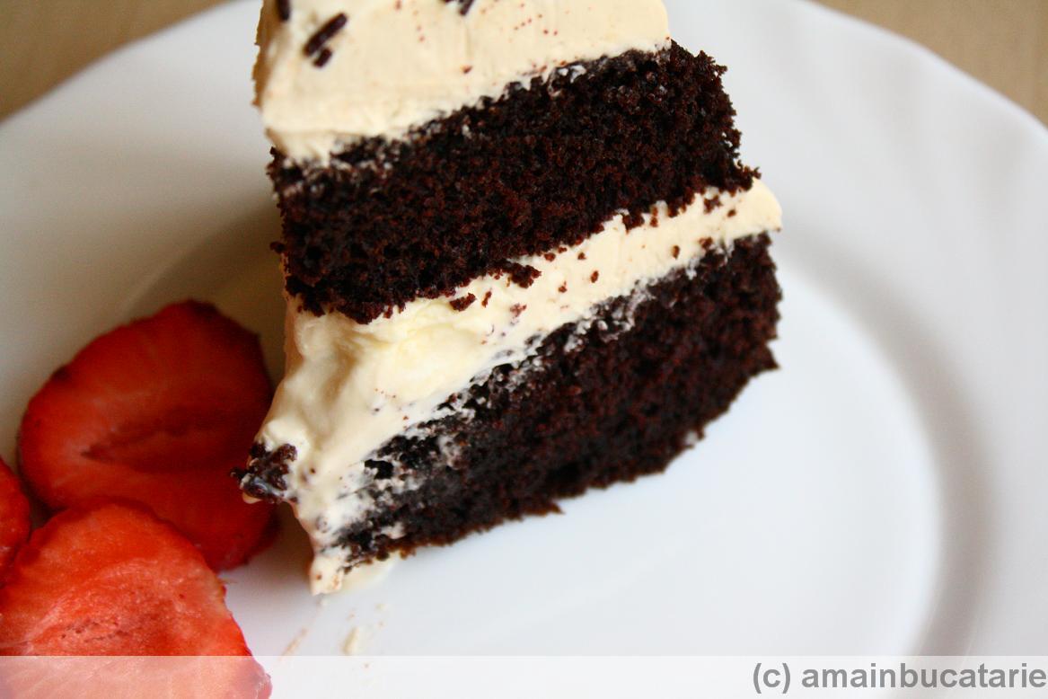 Restul cremei se intinde la suprafata tortului. Intindeti cu lingura pentru ca urmarim sa lasam cateva urme. Decorati cu ciocolata si daca e sezonul si cu capsuni.
